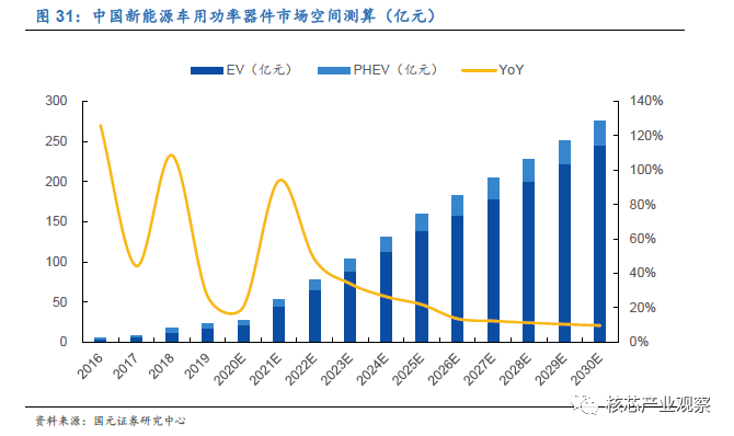 由于各車(chē)型有較大差別,假設(shè)純電動(dòng)車(chē)EV隨級(jí)別從A00-C類車(chē)單車(chē)功率器件用量也會(huì)變多,假設(shè)對(duì)應(yīng)功率器件價(jià)值量為800、1000、3000-3500元/輛。插電混動(dòng)車(chē)PHEV由于是在燃油動(dòng)力系統(tǒng)上外掛一套電動(dòng)系統(tǒng),假設(shè)功率器件用量為2100元/輛。測(cè)算結(jié)果中國(guó)新能源車(chē)用功率器件增量市場(chǎng)空間預(yù)測(cè)2025年達(dá)160億元,2030年達(dá)275億元。