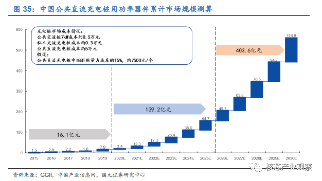 直流充電采用的是大功率充電,系統(tǒng)對(duì)功率半導(dǎo)體用量高于普通交流模式,其中對(duì)IGBT需求非常大。僅根據(jù)成本假設(shè)測(cè)算公共直流充電樁對(duì)功率器件的需求規(guī)模,2020-2025年累計(jì)市場(chǎng)需求約140億元,2025-2030年市場(chǎng)需求約400億元,未來(lái)10年直流充電樁建設(shè)對(duì)功率器件需求超過(guò)500億元。