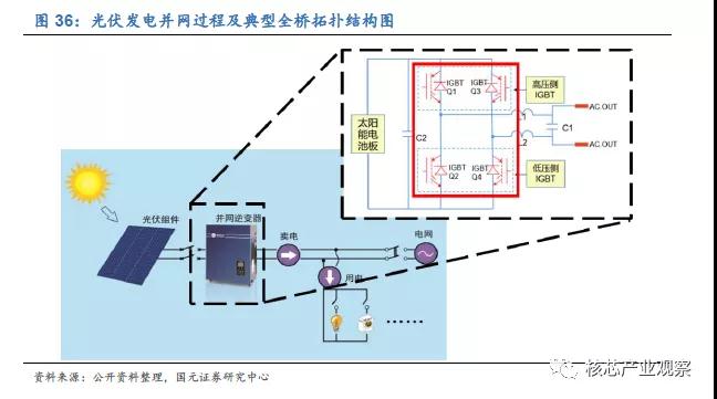 光伏發(fā)電是將太陽(yáng)能轉(zhuǎn)化成電能并導(dǎo)入電網(wǎng)的過(guò)程,系統(tǒng)由太陽(yáng)能電池組件、蓄電池、控制器組成,由于光伏發(fā)電過(guò)程中產(chǎn)生的是直流電,所以還需要配置光伏逆變器將直流電轉(zhuǎn)換成符合電網(wǎng)要求的交流電后才能并網(wǎng)使用。光伏逆變器是整個(gè)太陽(yáng)能發(fā)電系統(tǒng)的關(guān)鍵組件,其中IGBT是光伏逆變器的核心器件。光伏逆變器有兩個(gè)基本的功能:1)完成DC/AC轉(zhuǎn)換的電流連接到電網(wǎng);2)提高優(yōu)化光伏系統(tǒng)的能量轉(zhuǎn)化效率。逆變器拓?fù)浣Y(jié)構(gòu)的選擇和額定輸出功率有關(guān)。高壓大功率光伏逆變器可采用多電平拓?fù)洌械裙β使夥孀兤鞑捎萌珮?、半橋拓?fù)洌」β使夥孀兤鞑捎谜?、反激逆變拓?fù)洹?