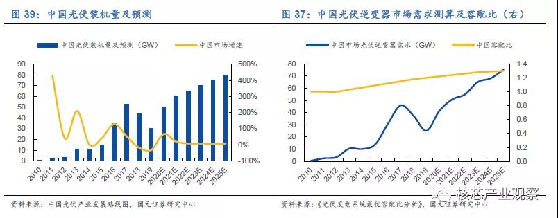 為實(shí)現(xiàn)[敏感詞]經(jīng)濟(jì)效益,光伏電站設(shè)計(jì)容配比逐漸上升趨勢(shì)。早期光伏系統(tǒng)設(shè)計(jì)容配比為1:1,后隨著技術(shù)創(chuàng)新,提高容配比有利于提升逆變器的運(yùn)行效率、電站收益。假設(shè)光伏逆變器替換周期為10年,每年光伏逆變器需求主要由當(dāng)年新增量和替換量組成。根據(jù)假設(shè),我們測(cè)算2025年中國(guó)光伏逆變器市場(chǎng)需求為75GW。