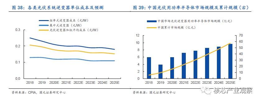 光伏逆變器一般分為三類:集中式、組串式和集散式。集中式由于規(guī)模效應(yīng)單位成本相對(duì)低于組串式,單位成本隨著技術(shù)成熟和規(guī)模量產(chǎn)成下降趨勢(shì)。根據(jù)CPIA預(yù)測(cè),2019年國(guó)內(nèi)光伏逆變器加權(quán)平均成本大約是0.2元/W,2025年有望降至0.15元/W。假設(shè)功率模塊和分立器件成本占總成本比例的9-10%,測(cè)算出中國(guó)光伏逆變器用功率半導(dǎo)體需求2019年約3.9億元,2025年9.61億元,國(guó)內(nèi)未來(lái)五年累計(jì)需求約50億元。