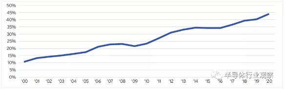 雖然IDM和無晶圓廠半導體公司都設計半導體,但無晶圓廠半導體公司選擇專注于設計并外包制造、組裝、封裝和測試。無晶圓廠半導體公司通常將制造外包給純代工廠以及組裝和測試(OSAT)公司。自20世紀90年代以來,無晶圓廠模式隨著半導體需求的增長而增長,因為創(chuàng)新的步伐使得許多公司越來越難以兼顧制造的資本密集和設計的高水平研發(fā)支出。技術難度和前期投資隨著向小型制造節(jié)點的遷移而激增,無晶圓廠企業(yè)占半導體總銷售額的比例從2000年的不到10%上升到2019年的近30%。