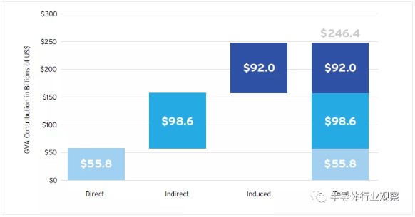 除了創(chuàng)造就業(yè)機會外,美國半導體行業(yè)對GDP和收入也有重大影響。2020年,美國半導體行業(yè)對GDP的貢獻為2464億美元。就收入影響而言,該行業(yè)在2020年為美國創(chuàng)造了1608億美元的收入,同時,也對其他行業(yè)產生了積極影響。例如,在該行業(yè)創(chuàng)造的185萬個直接和間接就業(yè)崗位中,許多都是在建筑、金融活動、休閑和酒店等不同行業(yè)創(chuàng)造的。