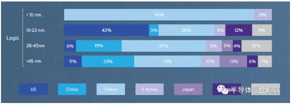 美國半導體行業(yè)在半導體研發(fā)和芯片設計方面處于全球領先地位。對于美國公司來說,無論是無晶圓廠半導體公司還是集成設備制造商(IDM),它們在全球半導體銷售額中的份額合計接近50%,關鍵的成功因素是獲得高技能工程人才和蓬勃發(fā)展的創(chuàng)新生態(tài)系統(tǒng),特別是來自領先大學的創(chuàng)新生態(tài)系統(tǒng)。美國半導體產業(yè)在研發(fā)密集型活動方面處于領先地位,而亞洲在制造工藝技術方面處于領先地位,這主要歸因于政府的激勵措施。而當涉及到低于10納米的前沿工藝時,美國并非如此。事實上,美國在28納米及以上的方面也遠遠落后。