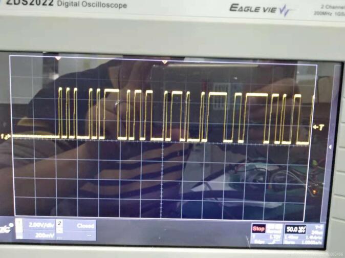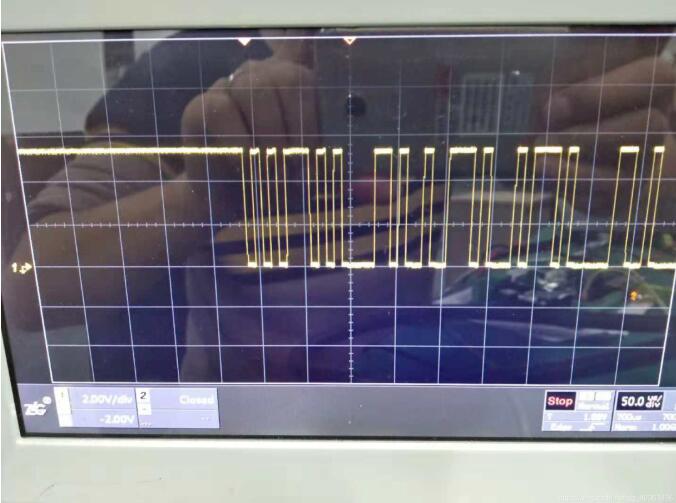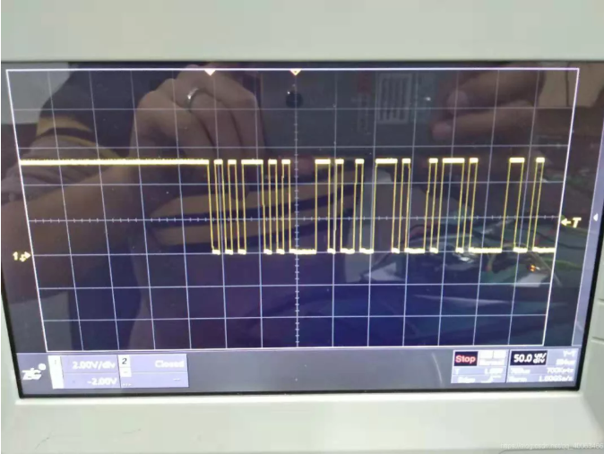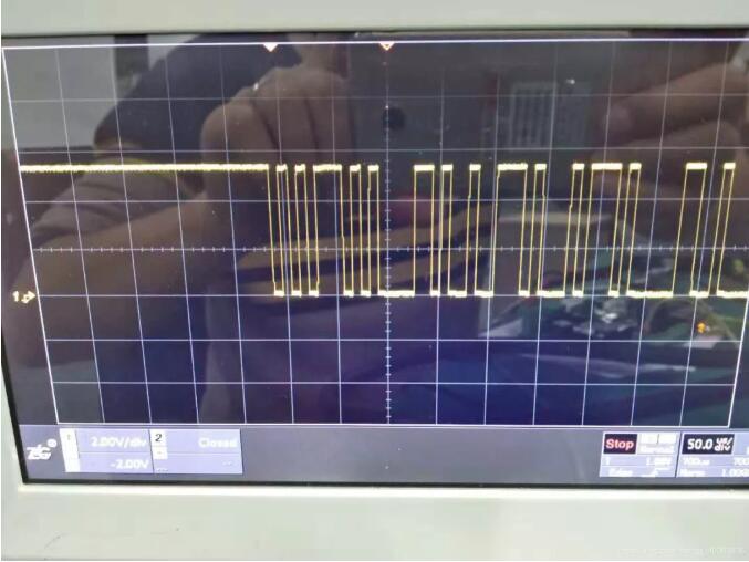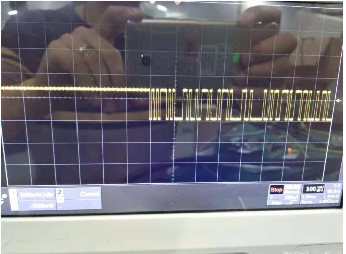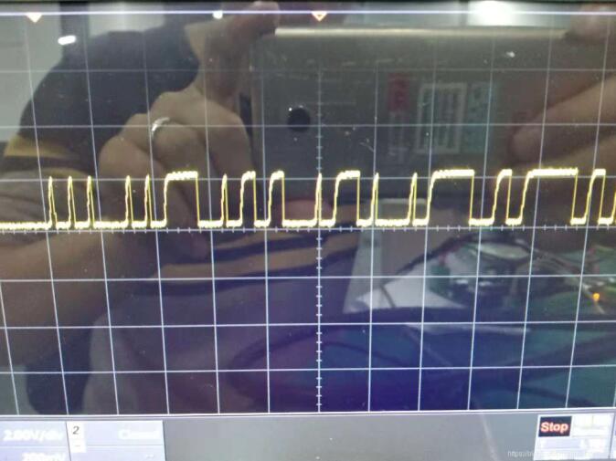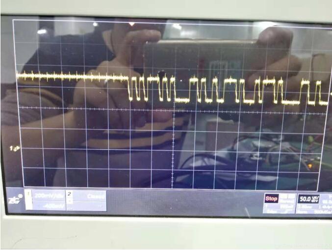 分別測量上圖中所標識的1、2、3點,其中電路設(shè)計中用的限流電阻為1K,三級管為9013。首先測量在常溫下三個測試點得波形吧,[敏感詞]點波形為隔離芯片ADuM1201輸出引腳,其波形如下圖所示,輸出電壓幅值為5V(忽略掉背景那個人影)。