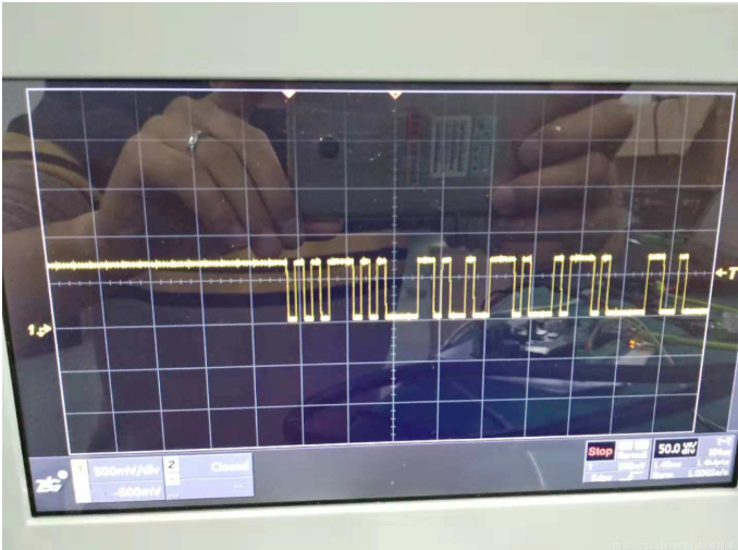 那么繼續(xù)測量第二點吧,當繼續(xù)加熱到溫度約為55度時第二點波形如下圖所示,其電壓的波動范圍變小約為100mV即高電平減小到0.6V,但是低電平還是約為0.5V,隨著溫度的繼續(xù)升高當溫度到65度時第二點電壓基本保持在0.5V,且三極管保持導(dǎo)通狀態(tài),因此RS485無法實現(xiàn)數(shù)據(jù)的發(fā)送。