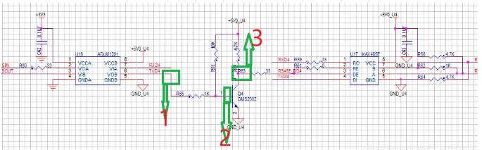 為了徹底解決這個問題(一勞永逸)經(jīng)過我苦思冥想(假的),根據(jù)三級管的溫度特性,導(dǎo)致了在高溫運行下基極門限電壓降低,若只是將ADuM1201輸出限流電阻減小會造成器件壽命減少影響產(chǎn)品質(zhì)量,因此現(xiàn)將三極管9013改為MOS管GMS2302,由于MOS管為壓控型器件其本身不會消耗太多功耗。