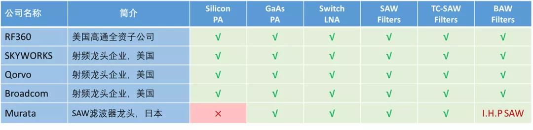 由此可見(jiàn),射頻前端是巨大的市場(chǎng),能容納5家國(guó)際巨頭持續(xù)發(fā)展。國(guó)際巨頭的技術(shù)跨度大,模組化能力強(qiáng);模組化產(chǎn)品是國(guó)際競(jìng)爭(zhēng)的主賽道。每家巨頭都擁有BAW技術(shù)或其替代方案。