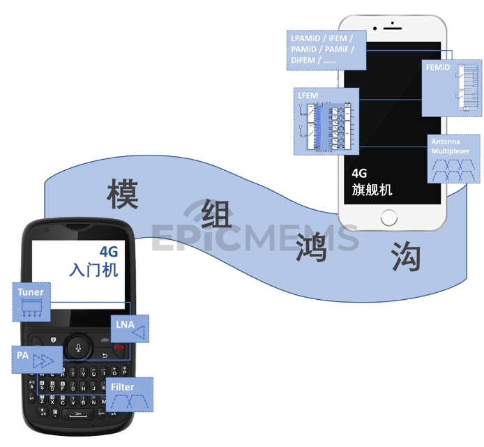 射頻模組芯片,不是一個(gè)新生的產(chǎn)品系列。事實(shí)上,射頻模組芯片的使用幾乎與LTE商業(yè)化同時(shí)發(fā)生。過(guò)去10年內(nèi),各種復(fù)雜的射頻模組已經(jīng)普遍應(yīng)用在了各品牌的旗艦手機(jī)中;與此同時(shí),在大量的入門(mén)級(jí)手機(jī)上,分立器件的方案也完全能夠滿足各方面的要求。因此在過(guò)去10年就出現(xiàn)了涇渭分明的兩個(gè)市場(chǎng):旗艦機(jī)型用模組方案;入門(mén)機(jī)型用分立方案。模組方案要求“高集成度和高性能”,因而價(jià)格也很高;而分立方案要求“中低集成度和中等性能”,售價(jià)相對(duì)而言就低不少。兩種方案之間存在巨大的技術(shù)和市場(chǎng)差異,我們可以把這個(gè)稱(chēng)作4G時(shí)代的“模組鴻溝”。