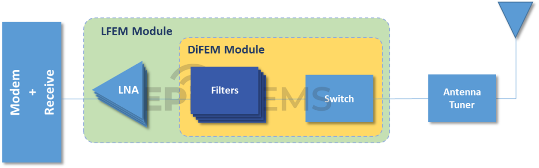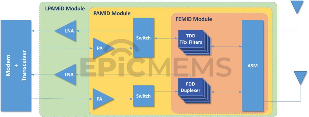 射頻前端模組是將射頻開(kāi)關(guān)、低噪聲放大器、濾波器、雙工器、功率放大器等兩種或者兩種以上的分立器件集成為一個(gè)模組,從而提高集成度和性能,并使體積小型化。根據(jù)集成方式的不同,主集天線射頻鏈路可分為:FEMiD(集成射頻開(kāi)關(guān)、濾波器和雙工器)、PAMiD(集成多模式多頻帶PA和FEMiD)、LPAMiD(LNA、集成多模式多頻帶PA和FEMiD)等;分集天線射頻鏈路可分為:DiFEM(集成射頻開(kāi)關(guān)和濾波器)、LFEM(集成射頻開(kāi)關(guān)、低噪聲放大器和濾波器)等。