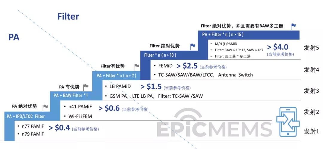 發(fā)射1:PA與LC型濾波器的集成,主要應(yīng)用在3GHz~6GHz的新增5G頻段,典型的產(chǎn)品是n77、n79的PAMiF或者LPAMiF。這些新頻段的5GPA設(shè)計(jì)非常有挑戰(zhàn),但由于新頻段頻譜相對(duì)比較“干凈”,所以對(duì)濾波器的要求不高,因此LC型的濾波器(IPD、LTCC)就能勝任。綜合來(lái)看,這類(lèi)產(chǎn)品屬于有挑戰(zhàn)但不復(fù)雜的產(chǎn)品,其技術(shù)和成本均由PA[敏感詞]掌控。