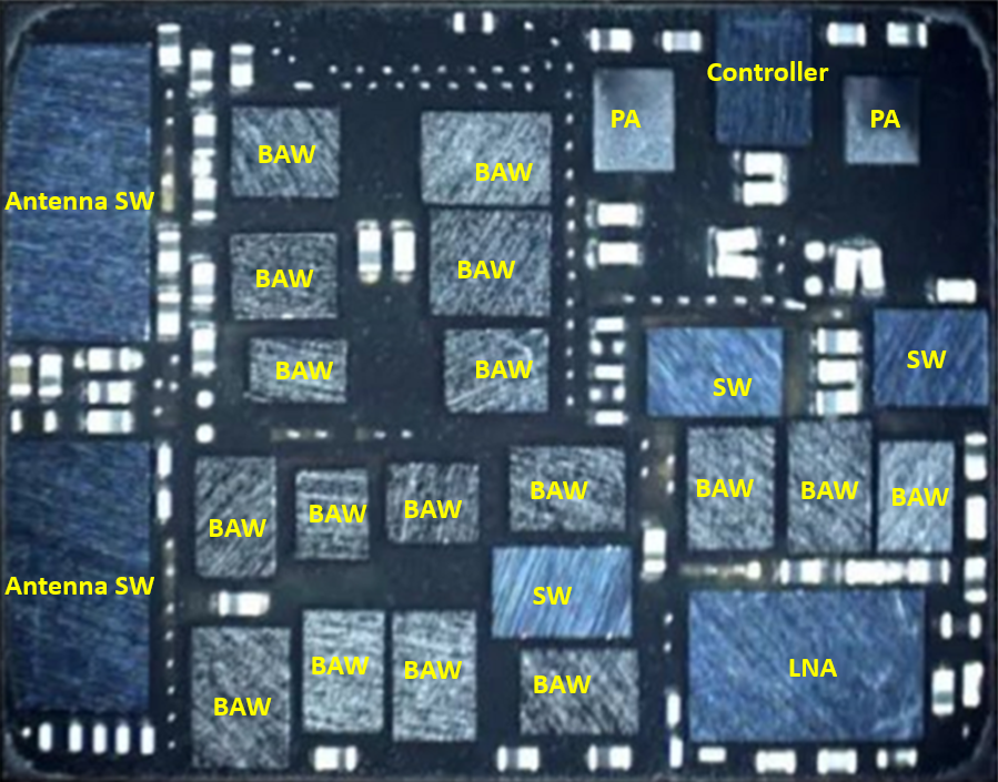 這類(lèi)高端產(chǎn)品的市場(chǎng),目前主要由美商Broadcom、Qorvo、RF360等廠商占據(jù)。下圖是Qorvo公司在其官方公眾號(hào)上提供的芯片開(kāi)蓋分析??梢钥吹?,該類(lèi)產(chǎn)品包含10顆以上的BAW,2~3顆的GaAs HBT,以及3~5顆SOI和1顆CMOS控制器,具有射頻產(chǎn)品[敏感詞]的技術(shù)復(fù)雜度。該類(lèi)產(chǎn)品通常需要集成四工器或者五/六工器這類(lèi)超高VD值的器件。