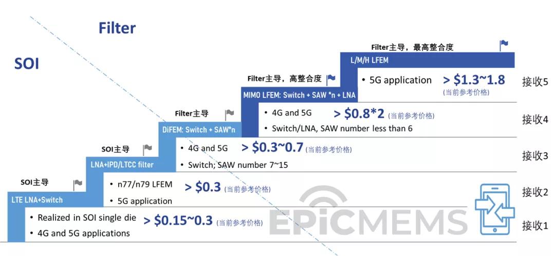 接收3:從接收3往上走,接收模組開(kāi)始需要集成若干SAW濾波器,集成度越來(lái)越高。通常需要集成單刀多擲(SPnT)或者雙刀多擲(DPnT)的SOI開(kāi)關(guān),以及若干通路支持載波聚合(CA)的SAW濾波器。封裝方式上,由于“接收3”的集成程度還不極限,因此有多種可能的路徑。其中國(guó)際廠商的產(chǎn)品主要以WLP技術(shù)為主,除了在可靠度及產(chǎn)品厚度方面有優(yōu)勢(shì),主要還是可以在更高集成度的其他產(chǎn)品中進(jìn)行復(fù)用。
