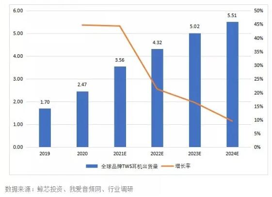 圖1:2019-2024年全球品牌TWS耳機(jī)出貨量預(yù)測