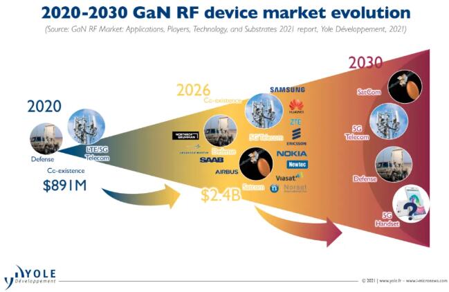 Yole預(yù)測,2026年GaN RF市場規(guī)模將達到24億美元(約153.6億人民幣),其中,2026年5G電信GaN RF營收占比將達到41%,約62.7億人民幣。
