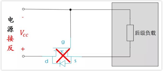 接反的電源不會懟到后面的負(fù)載上面,所以后級電路就不會燒了,我們只要把前面的電源正負(fù)極接對,那么后級電路又能正常工作了,如此,便實現(xiàn)了防反接的功能。