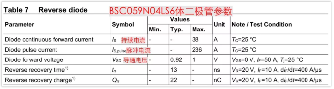 下面是BSC059N04LS6手冊里面的體二極管的參數(shù)