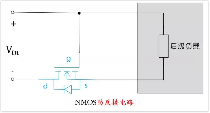 而實際應(yīng)用電路,NMOS會有電流從S到D的情況,比如下面這個NMOS管防電源反接電路(僅僅是個示意圖,實際電路需要多考慮一些因素)。