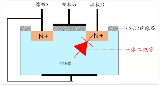 P和N型半導(dǎo)體放到一起,總會形成PN結(jié),也就是二極管。S和D之間體二極管實際是漏極D與襯底形成的,因為S和襯底是接到一起的,那么也就是D和S之間有個體二極管了。