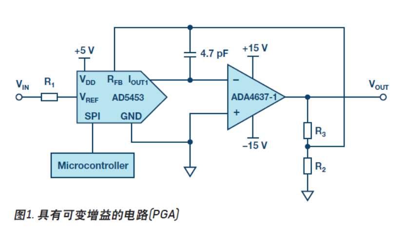 圖1顯示了一個(gè)帶下游放大器的14位MDAC AD5453 ,放大器可根據(jù)DAC的編程數(shù)字碼放大或削弱信號(hào)。