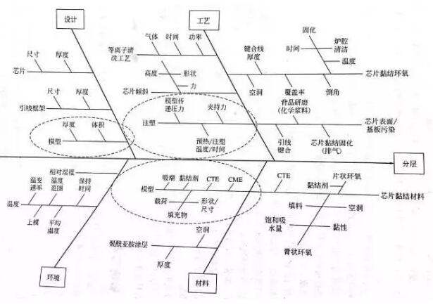 這一張圖所示的是展示塑封芯片分層原因的魚(yú)骨圖,從設(shè)計(jì)、工藝、環(huán)境和材料四個(gè)方面進(jìn)行了分析。通過(guò)魚(yú)骨圖,清晰地展現(xiàn)了所有的影響因素,為失效分析奠定了良好基礎(chǔ)。