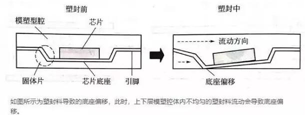 如圖所示為塑封料導(dǎo)致的底座偏移,此時(shí),上下層模塑腔體內(nèi)不均勻的塑封料流動(dòng)會(huì)導(dǎo)致底座偏移。