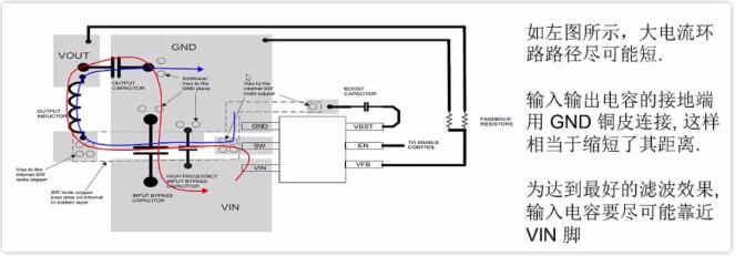 ① 輸入輸出電容的GND用銅皮進(jìn)行連接,擺件時(shí),兩者的地盡量放一起;