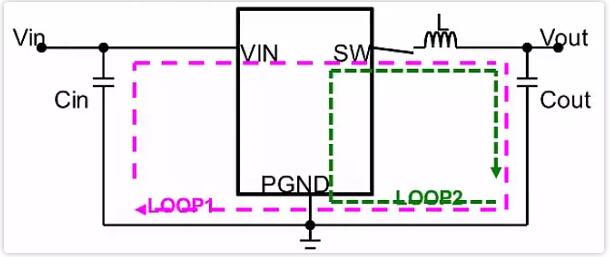 下圖中紅色LOOP1為DC-DC高邊管導(dǎo)通,低邊管關(guān)閉時(shí)的電流流向;綠色LOOP2的為高邊管關(guān)閉,低邊管開啟時(shí)的電流流向;