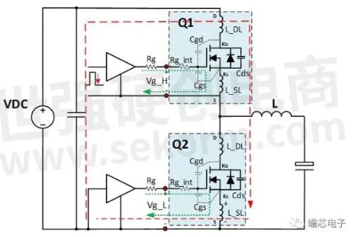 TO247-3封裝內(nèi)部的內(nèi)部公共Source電感會(huì)減緩MOSFET開通和關(guān)斷的速度,從而增加了開關(guān)損耗,而TO247-4因?yàn)橛袉为?dú)的一根Source引線用于驅(qū)動(dòng),從而旁路了內(nèi)部公共Source電感,避免了內(nèi)部公共Source電感對(duì)開關(guān)過程的影響,從而達(dá)到減小開關(guān)損耗的目的。首先看下開通過程,典型的雙脈沖實(shí)驗(yàn)中通過開關(guān)上管來實(shí)現(xiàn),我們主要聚焦上管Vgs回路。當(dāng)上管開通時(shí),Q1的Id是增加的,那么L_SL感應(yīng)出來的電壓是上正下負(fù),其電壓和外部所加的驅(qū)動(dòng)電壓(正電壓)極性相同,導(dǎo)致內(nèi)部MOSFET-Die上的Vgs電壓減小,從而減緩了MOSFET開通過程。