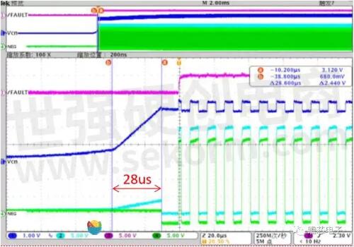 瞻芯電子開發(fā)了工業(yè)界[敏感詞]采用8引腳封裝,集成負(fù)壓驅(qū)動(dòng)的35V/4A驅(qū)動(dòng)器IVCR1401D/IVCR1401DP. 在驅(qū)動(dòng)器啟動(dòng)后,NEG輸出被拉至GND,內(nèi)部的電流源快速為負(fù)壓電容充電,負(fù)壓建立后,NEG引腳被釋放,內(nèi)部的負(fù)壓調(diào)節(jié)器可將負(fù)壓調(diào)節(jié)至-3.5V以正常運(yùn)行,之后,柵極驅(qū)動(dòng)信號(hào)NEG在(VCC-3.5V)和-3.5之間進(jìn)行切換,如下圖所示為負(fù)壓電容的負(fù)壓建立過程,1uF電容充電大約需要28us。應(yīng)使用超過100倍Cg電容的X7R電容,來減小負(fù)壓電容上的紋波,使負(fù)壓可靠穩(wěn)定的建立運(yùn)行并進(jìn)行驅(qū)動(dòng)。在我司的老化測(cè)試系統(tǒng)電路已經(jīng)使用該芯片進(jìn)行過驗(yàn)證,在1000V/20A/125℃的運(yùn)行條件下驅(qū)動(dòng)SiC MOSFET,連續(xù)運(yùn)行1000h后,仍然能夠穩(wěn)定可靠的進(jìn)行驅(qū)動(dòng)。