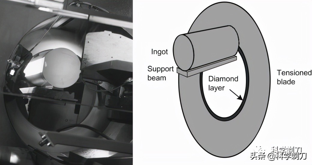 內(nèi)圓切割機就是使用的是一種環(huán)狀刀片,中空,環(huán)狀刀片的內(nèi)環(huán)邊緣用顆粒狀金剛石,將硅碇放在中間的圓環(huán)中來回動,這種環(huán)抱式的切割方法比通常的電鋸式切割要更加的穩(wěn)定,但這種方法損耗大,對硅片的損傷也大。