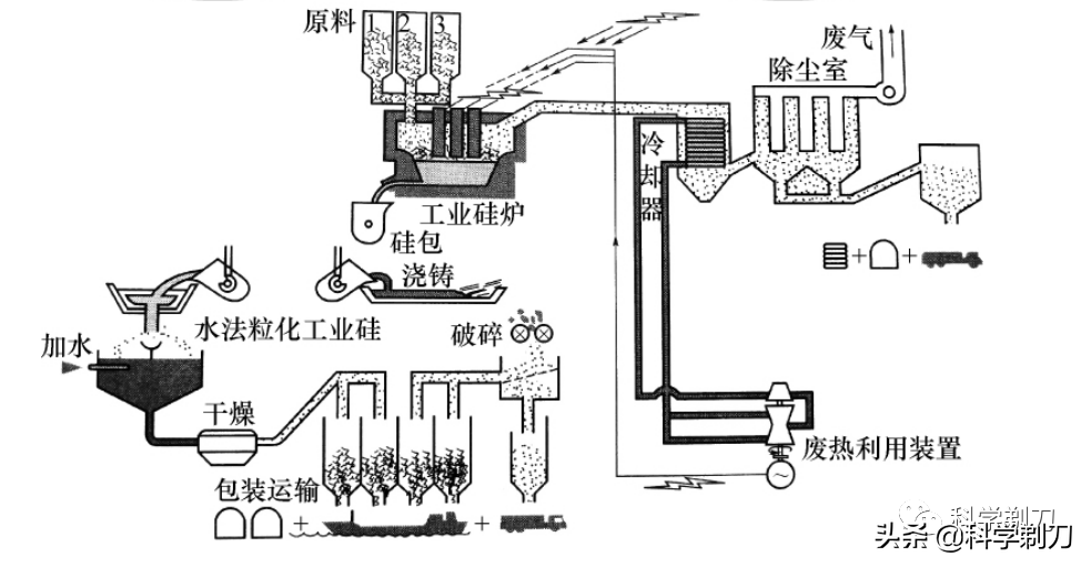 通常是在石墨電弧爐中進行,將石英巖(或沙子)與焦炭、煤及木屑等混合,加熱到1500到2000攝氏度時進行碳熱還原反應(yīng)。