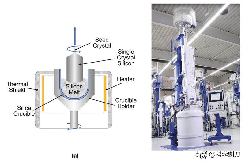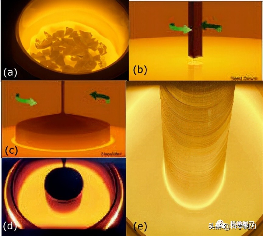 對于微電子工業(yè)來說,這是極其重要的一步,是從多晶到單晶,本質(zhì)上就是要把硅原子由液相的隨機排列直接變?yōu)橛行蜿嚵校刹粚ΨQ結(jié)構(gòu)變?yōu)閷ΨQ結(jié)構(gòu)。但這種轉(zhuǎn)變是通過固液界面的移動完成的,這種要求決定了單晶硅是從熔融的多晶硅中生長出來的,應(yīng)用最廣泛的便是坩堝直拉法。這種方法又被稱為切克勞斯基法,由其在1917年建立的晶體生長方法,簡稱CZ法,