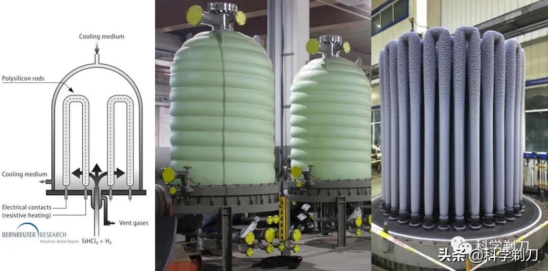 反應(yīng)方程如上。使用氫氣作為還原劑,將氫通入三氯氫硅液體中鼓泡,使高純硅沉積在1100-1200度的高純硅細棒上(通常在用于沉積的純硅細棒上通上大電流,使其達到所需的溫度),生成的多晶硅棒直徑可達到15-20厘米。用于還原的氫氣必須也是高純度的。