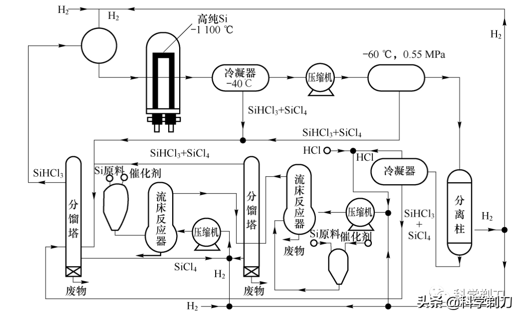 反應(yīng)方程如上圖。將硅粉(SI)和氯化氫(HCl)即鹽酸在300度和0.45兆帕的壓力下,經(jīng)過催化合成反應(yīng)生成三氯氫硅(又被稱為三氯硅烷或硅氯仿),這一過程被稱為氯化粗硅。