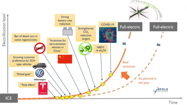車(chē)輛電氣化的初始戰(zhàn)略實(shí)施正在加速,因?yàn)椴糠值貐^(qū)/城市禁止使用柴油車(chē),客戶(hù)對(duì)SUV型車(chē)輛的偏好不斷增加,大眾“柴油機(jī)門(mén)”、“特斯拉效應(yīng)”、中國(guó)零排放汽車(chē)的激勵(lì)措施、電池成本降低、二氧化碳減排目標(biāo),NEDC(新歐洲行駛工況)→WLTP(全球統(tǒng)一輕型車(chē)輛試驗(yàn)程序),包括新冠疫情,都在推進(jìn)車(chē)輛電氣化進(jìn)程。