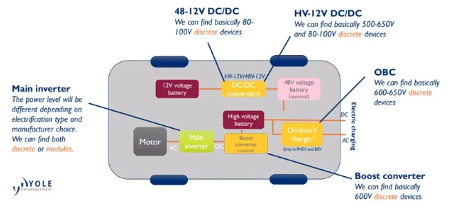 目前看,在EV/HEV中的功率電子技術(shù)中,根據(jù)電氣化類(lèi)型和制造商選擇的不同功率水平,主逆變器既可以是分立式器件,也可以是模塊;48-12V DC-DC基本上是80-100V分立器件;HV-12V DC-DC基本上是500-650V和80-100V分立器件;OBC基本上是600-650V分立器件;升壓轉(zhuǎn)換器基本上是600V分立器件。
