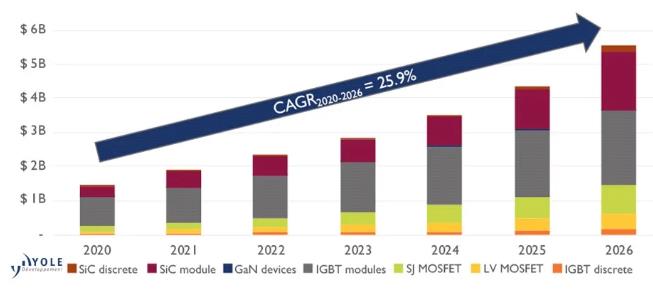關(guān)于功率半導(dǎo)體市場(chǎng),由于IGBT和SiC模塊之間的重大技術(shù)角逐,預(yù)計(jì)其價(jià)值將在2020年至2026年翻三番。事實(shí)上,SiC模塊目前的成本仍然是650V IGBT模塊的3倍左右,但當(dāng)生產(chǎn)批量更大時(shí),隨著向8英寸晶圓的過(guò)渡,以及獲得更高電池電壓的1200V器件的普及,這一差距將逐步縮小。