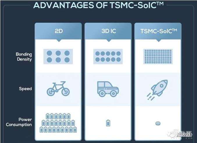 通過采用硅穿孔(TSV)技術(shù),臺積電 SoIC 技術(shù)可達到無凸起的鍵合結(jié)構(gòu), 從而可將不同尺寸、制程、材料的小芯片重新集成到一個類似 SoC 的集成芯片中,使最終的集成芯片面積更小,并且系統(tǒng)性能優(yōu)于原來的 SoC。