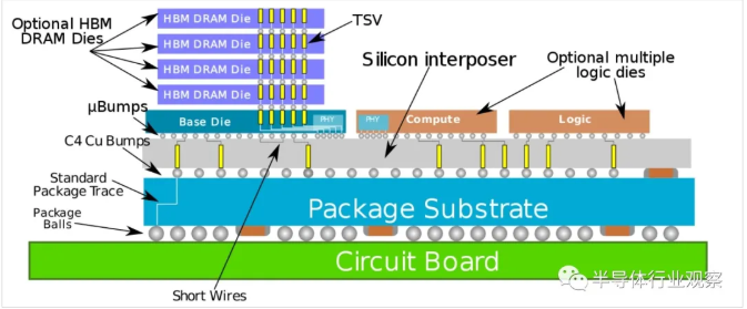 在傳統(tǒng) PCB 封裝中,走線密度和信號傳輸速率難以提升,因而內(nèi)存帶寬緩慢增長。而先進封裝的走線密度短,信號傳輸速率有很大的提升空間,同時能大大提高互連密度,因而先進封裝技術(shù)成為解決內(nèi)存墻問題的主要方法之一。