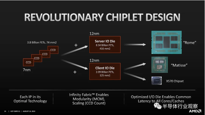 也就是說,將原先整個 SoC 芯片 " 化整為零 ",先做成如 CPU、GPU、I/O 等幾個大部分,再將 SoC 的細粒度進一步提升,將以前按照功能性來組合的思路,轉(zhuǎn)變?yōu)榘淳?IP 來進行組合。