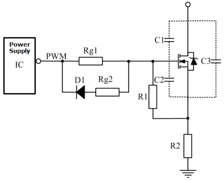 其中D1通常采用快恢復(fù)二極管,縮短了關(guān)斷時間并降低了關(guān)斷損耗;Rg2的作用是防止電源IC在關(guān)斷時因電流過大而燒壞。