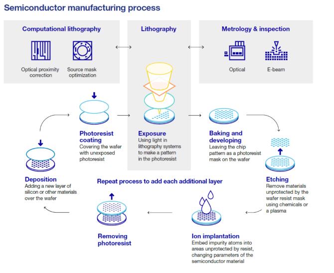 半導(dǎo)體制造流程很長(zhǎng),前道制造大體可以分為七個(gè)環(huán)節(jié),即涂膠、光刻、烘烤、刻蝕、離子注入、去膠、沉積,光刻是七大環(huán)節(jié)之一,也是最重要的一個(gè)環(huán)節(jié),直接決定了半導(dǎo)體產(chǎn)線(xiàn)能夠加工的晶體管尺寸大?。垂に嚬?jié)點(diǎn))和產(chǎn)出率。據(jù)西南證券收集的數(shù)據(jù),光刻環(huán)節(jié)耗時(shí)占晶圓制造全流程的40%至50%,光刻工藝成本占芯片生成成本的30%左右。