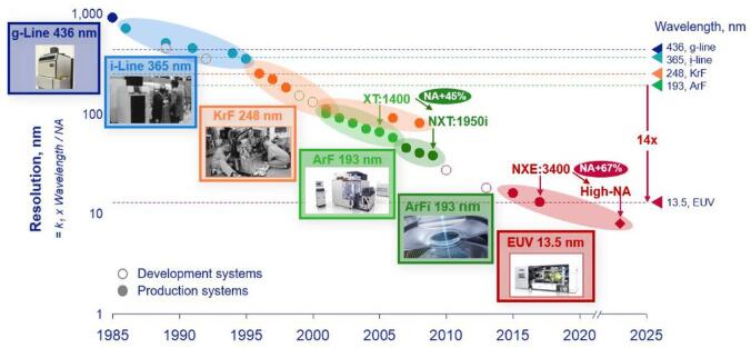 減小光源波長(zhǎng)是光刻機(jī)提升加工精度的主要技術(shù)方向。市場(chǎng)主流光刻機(jī)的光源波長(zhǎng),也從1980年代的436納米(所謂g-Line),縮小到如今13.5納米的極紫外波長(zhǎng)。在光刻機(jī)領(lǐng)域,ASML并不是一開(kāi)始就像現(xiàn)在這樣一枝獨(dú)秀,在g-Line(436納米波長(zhǎng)光源)和i-Line(365納米波長(zhǎng)光源)時(shí)代,日本廠商優(yōu)勢(shì)明顯,進(jìn)入248納米光源之后,ASML逐漸追上。