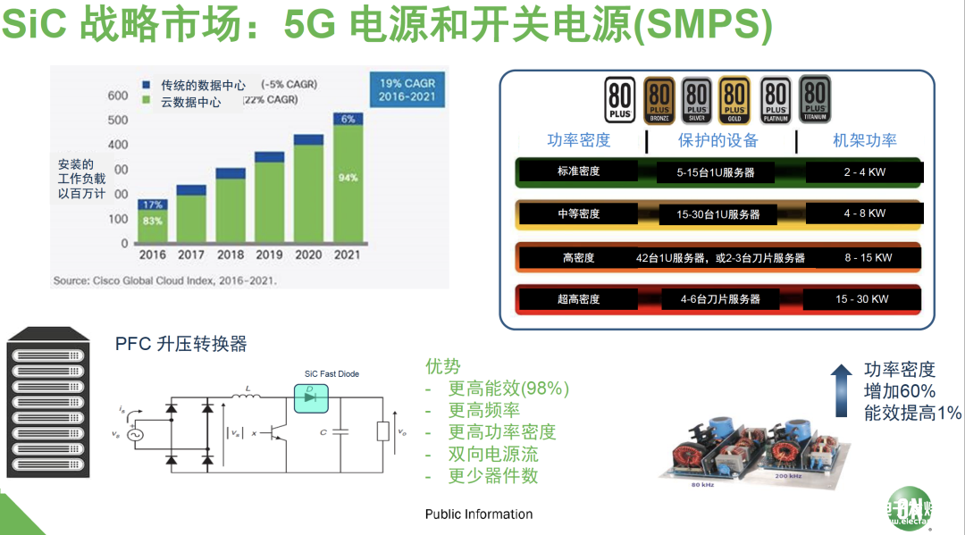 傳統(tǒng)的開關(guān)電源領(lǐng)域是Boost及高壓電源,對功率密度一直都有很高的要求,從最早通信電源的金標(biāo)、銀標(biāo),到現(xiàn)在的5G通信電源和云數(shù)據(jù)中心電源,這些都對高能效有很高的要求。