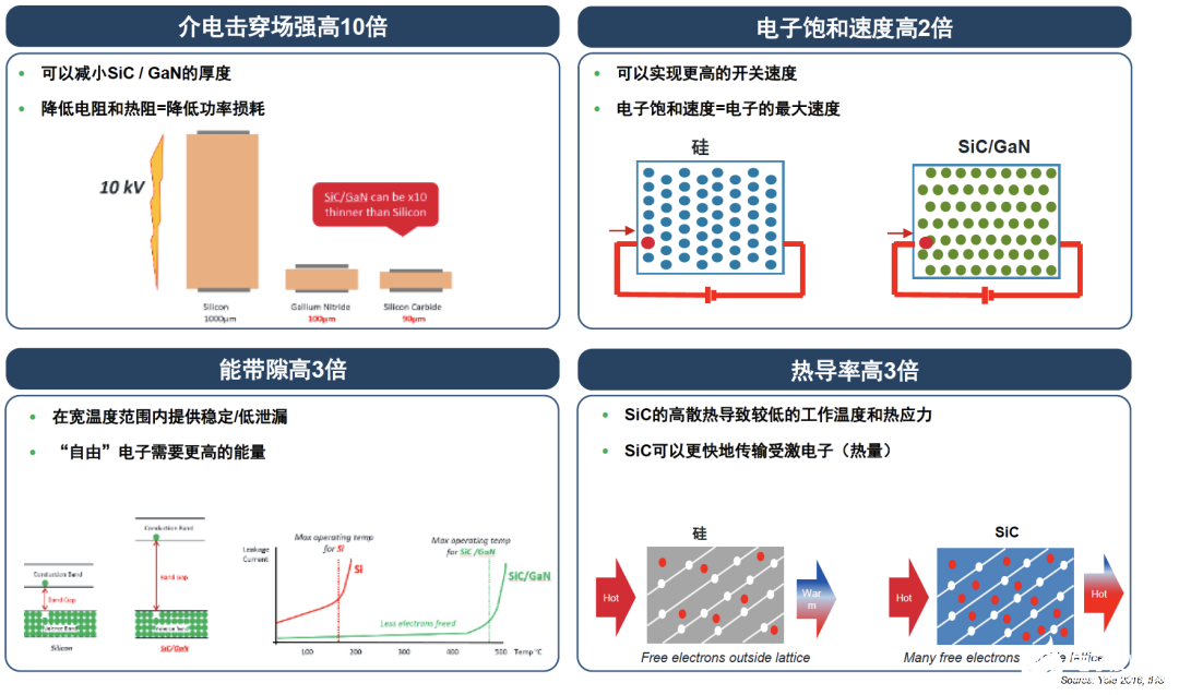 SiC由純硅和碳組成,與硅相比具有三大優(yōu)勢:更高的臨界雪崩擊穿場強、更大的導(dǎo)熱系數(shù)和更寬的禁帶。