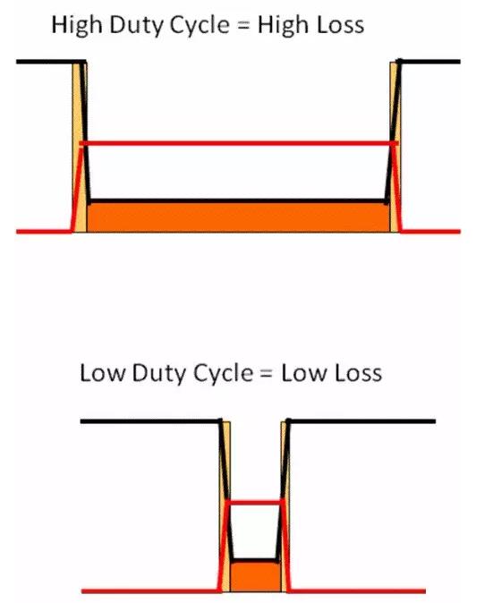 開(kāi)關(guān)電壓和電流均為非零時(shí),AC 開(kāi)關(guān)損耗出現(xiàn)在開(kāi)關(guān)導(dǎo)通和關(guān)斷之間的過(guò)渡期間。圖 2 中高亮部分顯示了這種情況。根據(jù)方程式 4),降低這種損耗的一種方法是縮短開(kāi)關(guān)的升時(shí)間和降時(shí)間。通過(guò)選擇一個(gè)更低柵極電荷的 FET,可以達(dá)到這個(gè)目標(biāo)。另一個(gè)因數(shù)是開(kāi)關(guān)頻率。開(kāi)關(guān)頻率越高,圖 3 所示升降過(guò)渡區(qū)域所花費(fèi)的開(kāi)關(guān)時(shí)間百分比就越大。因此,更高頻率就意味著更大的AC開(kāi)關(guān)損耗。所以,降低 AC 損耗的另一種方法便是降低開(kāi)關(guān)頻率,但這要求更大且通常也更昂貴的電感來(lái)確保峰值開(kāi)關(guān)電流不超出規(guī)范。