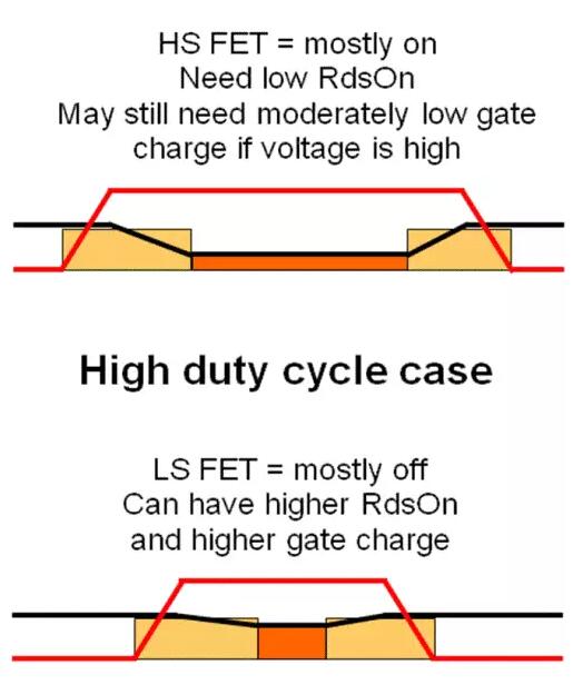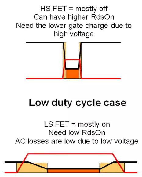 低占空比設(shè)計(jì)意味著高輸入電壓,對(duì)這些設(shè)計(jì)而言,高側(cè) FET 大多時(shí)候均為關(guān)斷,因此 DC 損耗較低。但是,高 FET 電壓帶來(lái)高 AC 損耗,所以可以選擇低柵極電荷的 FET,即使導(dǎo)通電阻較高。低側(cè) FET 大多數(shù)時(shí)候均為導(dǎo)通狀態(tài),但是 AC 損耗卻最小。這是因?yàn)椋瑢?dǎo)通/關(guān)斷期間低側(cè) FET 的電壓因 FET 體二極管而非常地低。因此,需要選擇一個(gè)低導(dǎo)通電阻的 FET,并且柵極電荷可以很高。圖 7 顯示了上述情況。