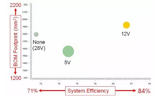 中間軌電壓的不同選擇為 28V(直接使用輸入電源)、12V 和 5V。這會(huì)帶來(lái)不同的 POL 穩(wěn)壓器占空比。