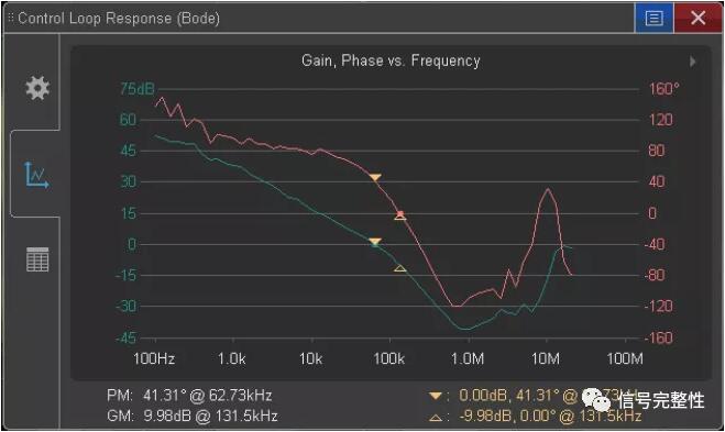我們可以看到測試結(jié)果中低頻時(shí)增益和相位結(jié)果有抖動(dòng),這種結(jié)果說明在這種頻率下信噪比可能太低了。一個(gè)簡單的提高信噪比的方法是把所有頻段的注入電壓幅值提高。但是提高注入電壓可能會(huì)造成信號失真或者0dB穿越時(shí)對應(yīng)的相位裕度結(jié)果不對。
